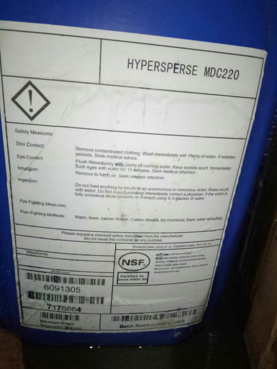反滲透阻垢劑、分散劑DC220為弱酸性,操作時注意勞動保護,應(yīng)避免與皮膚、眼睛等接觸,接觸后用大量清水沖洗。