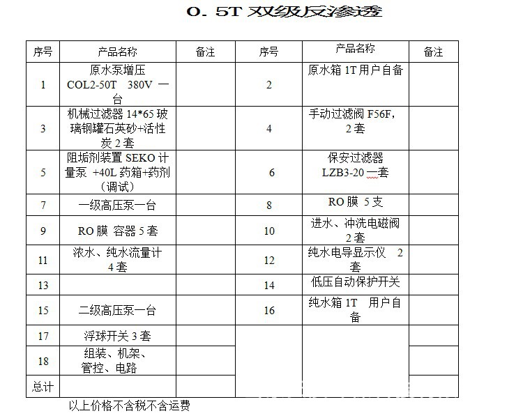 本設(shè)計(jì)方案是根據(jù)用戶的要求采用二級反滲透工藝制取用水。系統(tǒng)產(chǎn)水量為0.5m3/h。原水為井水、地下水、自來水等,經(jīng)過機(jī)械過濾器去除水中懸浮物,膠體等雜質(zhì),再經(jīng)活性炭過濾器去除水中有機(jī)物,異味和色味等,精密過濾器去除水中細(xì)小顆粒。組合成完整的預(yù)處理系統(tǒng),使水滿足RO反滲透進(jìn)水要求,以保證RO反滲透設(shè)備長期穩(wěn)定運(yùn)行。水經(jīng)二級反滲透處理后出水水質(zhì)可以滿足用戶要求。